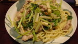 - いつものペペロンチーノの味付けにかつおとしょう油を加えると、一気に日本酒に合うおつまみに。和に偏りすぎないよう、しょう油は控えめにします。