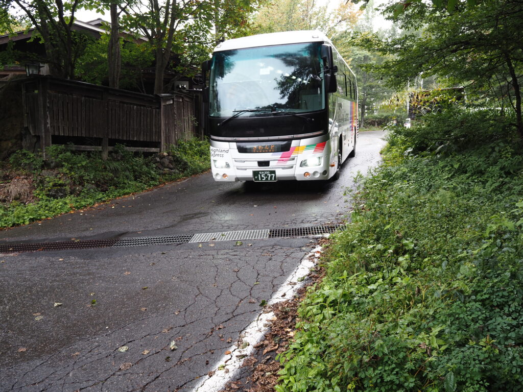 雨に濡れた艶やかな秋の気配に若干の感傷を噛みしめていると、『アルピコ交通』のバスが到着。往路と同じく、まずはここからバスの結節点であるさわんどバスターミナルへと向かいます。