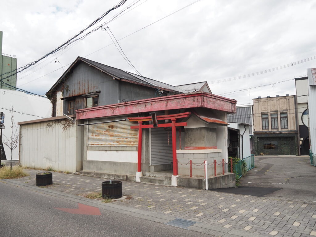 キバナコスモスが可憐に咲く女鳥羽川を橋上から眺めていると、何やら気になる一角が。近づいてみれば、なんとも渋い佇まいの建物に組み込まれるお稲荷さん。その奥にも、年代を感じさせる瀟洒な看板建築が。