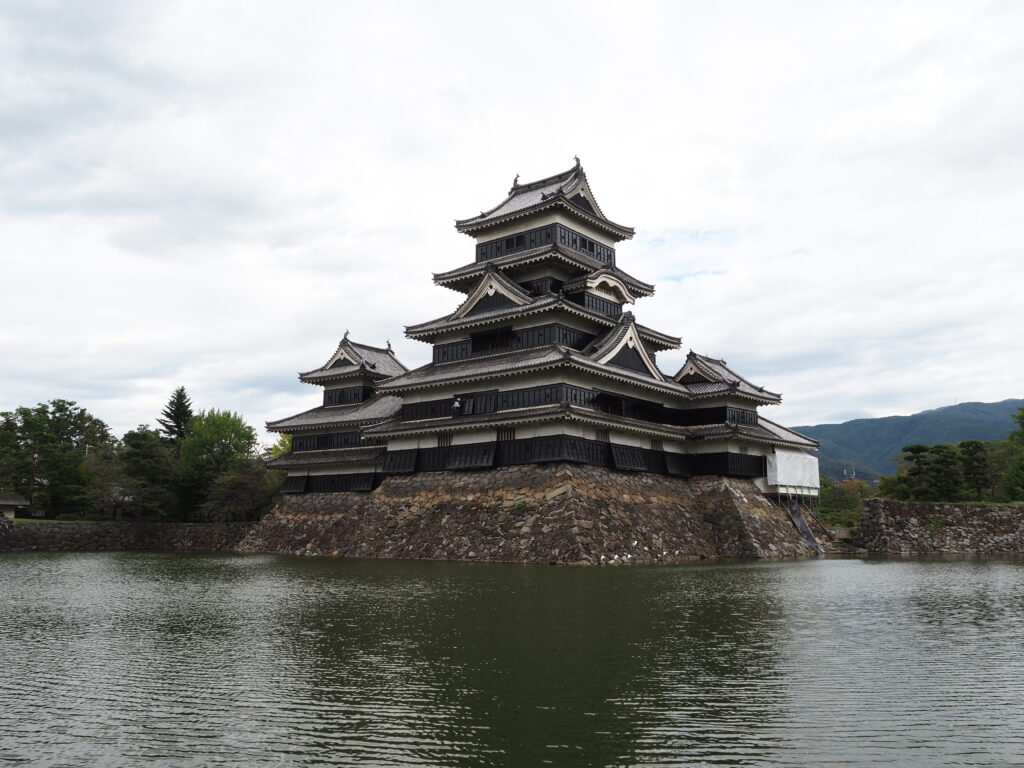 発掘の様子を眺めつつ進んでゆくと、ついに姿をあらわした松本城。曇天の下聳える、現存天守。ちょうど漆の塗り替え期間中のようで、職人さんが作業中。艶めきと深みを増した漆黒と白漆喰、その締まりのある対比に息を呑む。