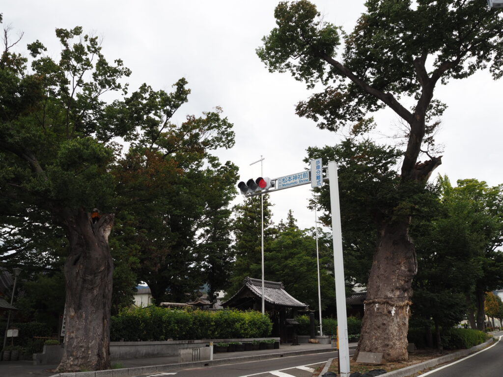 お城の北側から出ると、松本神社前と標識の掲げられた信号が。10年前にこの近くを通ったときは、神社があったとは全く気づかなかった。せっかくなのでお参りしていこう。とその前に、交差点の角にある井戸で空になったペットボトルに湧水を補給。