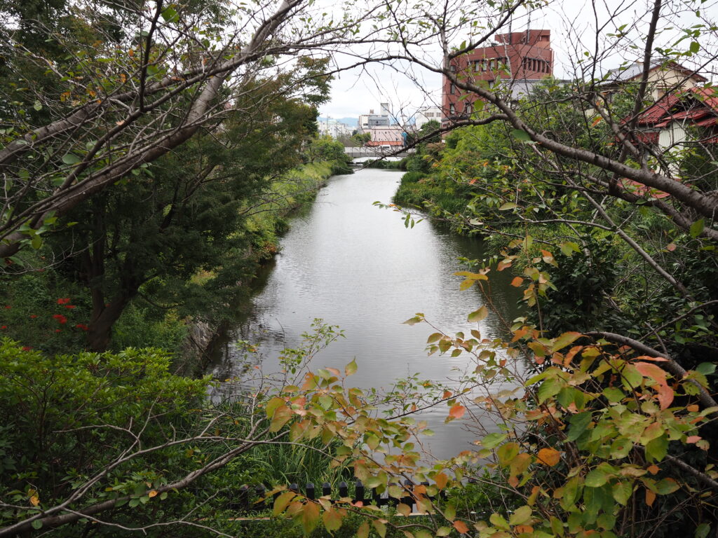 次へとつながる宿題を手に入れつつ、お城の方へ南下。するとそこには、突如現れる水堀が。現在も松本城天守を護る内堀と外堀、そのさらに外側にはかつて総堀がぐるりと廻らされていたそう。明治以降そのほとんどが市街地へと姿を変えましたが、ここだけは埋め立てを免れました。