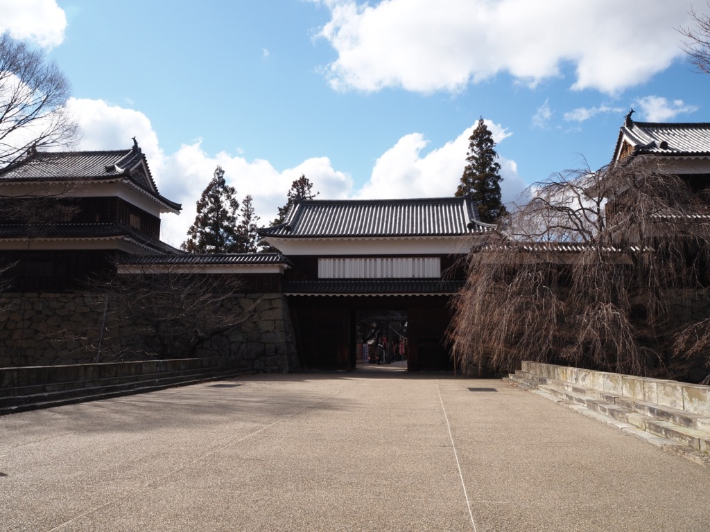 観光案内所で手に入れた地図に従い進んでゆくと、通りの突き当りに現れるお堀と土塀。それに沿って歩いてゆくと、歴史を感じさせる重厚な門が。