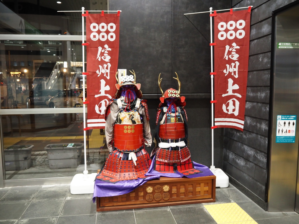 3月上旬初めての上田新幹線改札内コンコースに飾られた真田の赤備え
