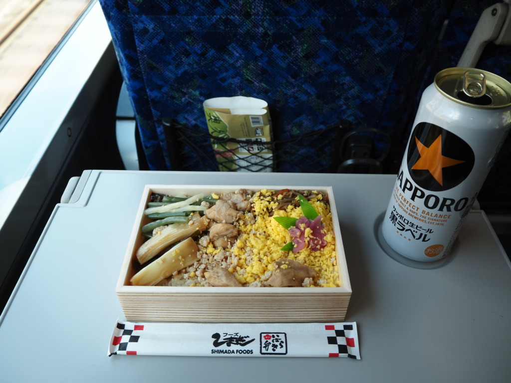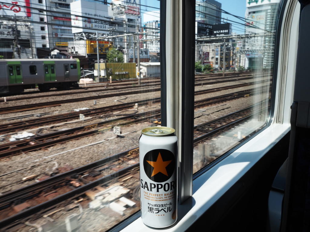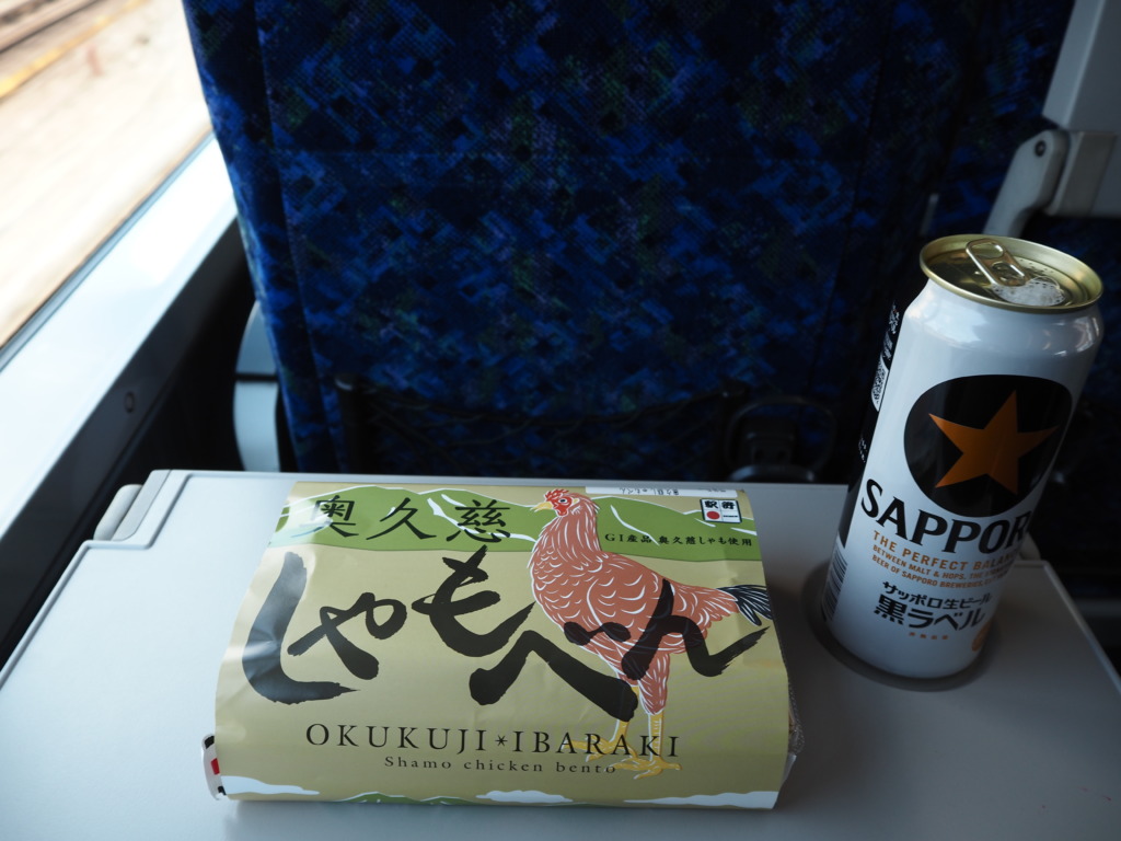 無料のグリーン車という最高のアテを噛みしめつつ、並走する山手線を横目に冷たい金星で旅立ちの祝杯を。食欲中枢がぐわっと刺激されたところで、高田馬場を通過するころにははやくも旅のお供を開けることに。