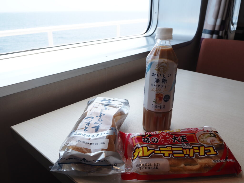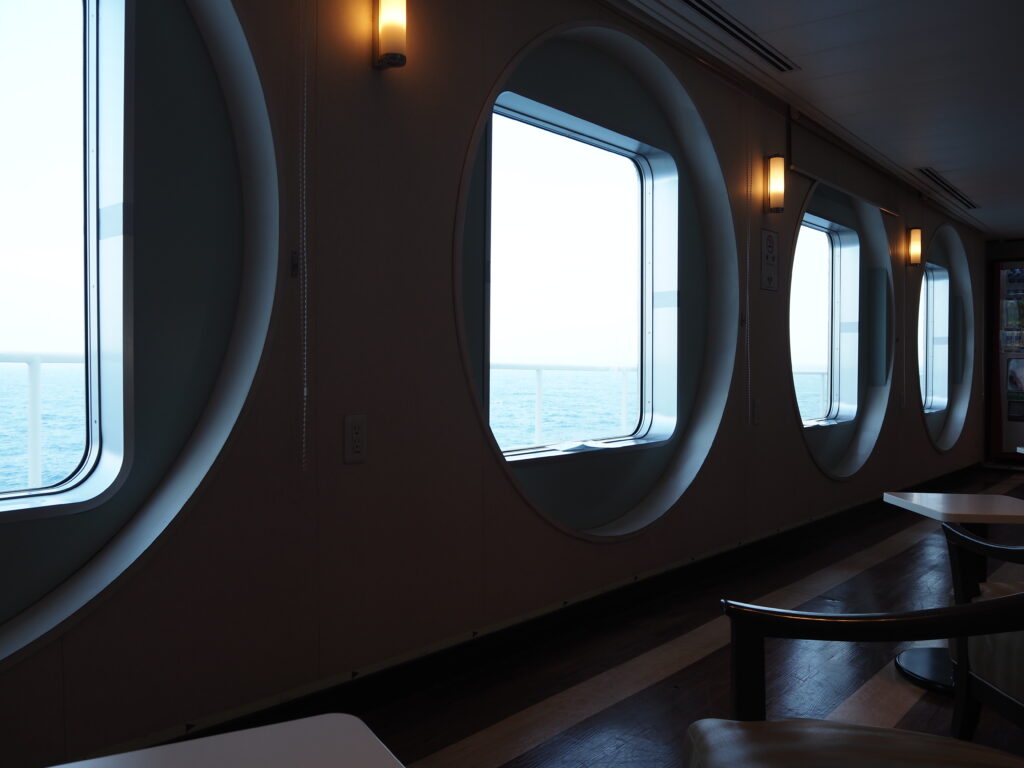 風呂に入ったり、船内でゆったりしたり、自室でうたた寝したり。そんなゆるゆるとした時間を過ごしていると、もうお昼どきに。朝食にと買っておいたパンを携え、パブリックスペースに移動します。