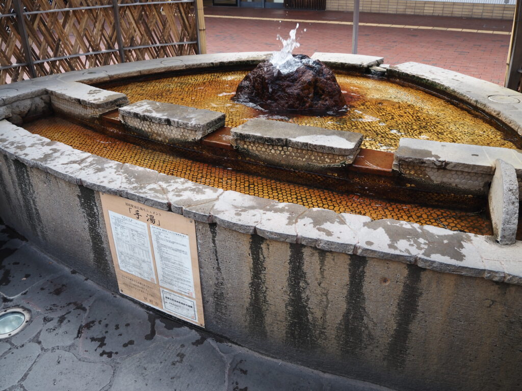 その隣、大きな竹籠のなかには温泉地らしい手湯が。なんとも贅沢な源泉かけ流し、温泉分析書まで掲出するというこだわりよう。ぼこぼこと滾ってはいますが、お湯自体はちょうど良い塩梅。手を浸ければぽかぽかとした温もりに包まれ、手軽に温泉気分を愉しめます。