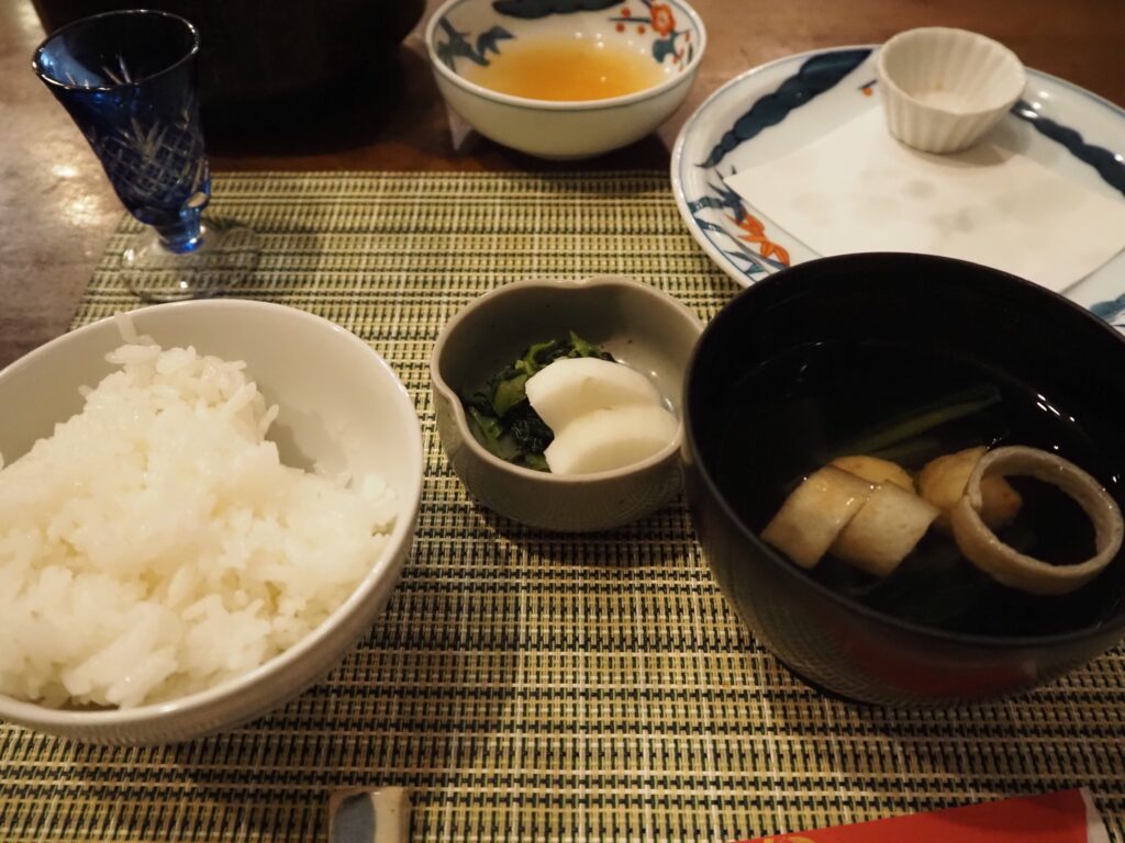 数々のおいしい品々に満たされ、満腹になりつつ白いご飯で〆ることに。もっちり甘うまのお米に合わせるのは、九州といえばの高菜。まだ青みが残る程度の漬け方で、これがまた最強のご飯の友。旨い旨いとあっという間に平らげ、おだしと柚子のきいたお吸い物で至福の余韻を流します。