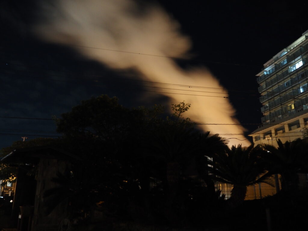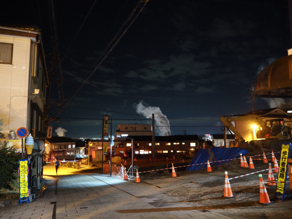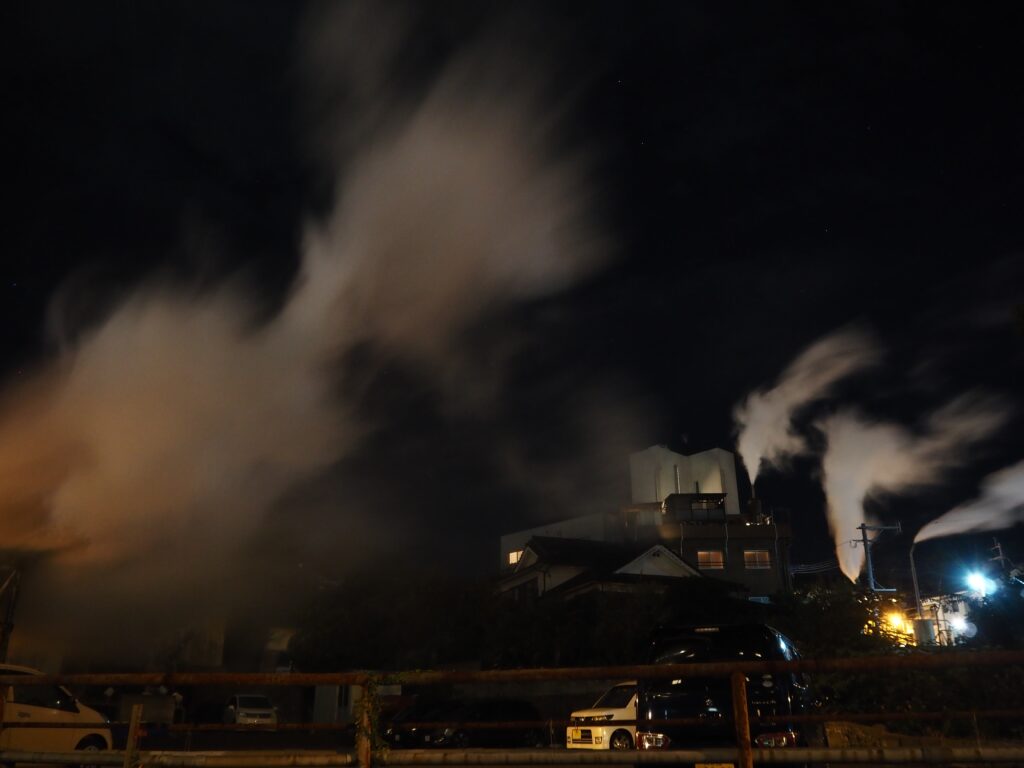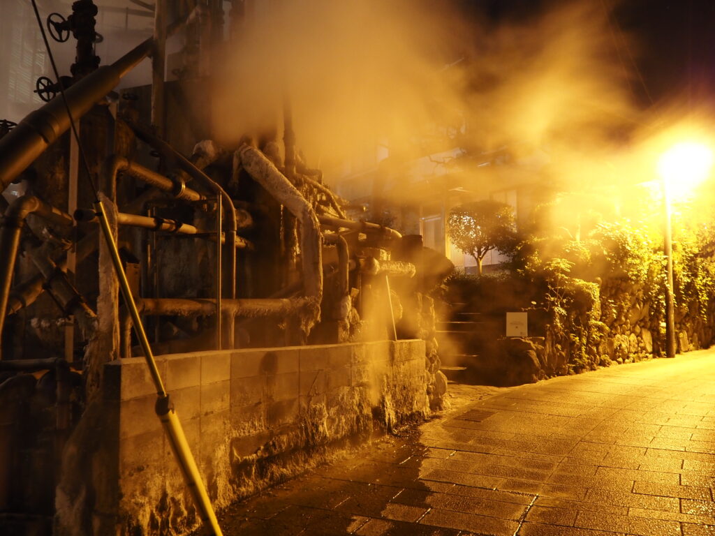 街灯に照らされた艶めかしい情緒に誘われ進んでゆくと、小径の脇に姿をあらわす温泉設備。縦横無尽に廻らされた配管、そこからもうもうと噴き出す蒸気。パイプもコンクリートブロックも析出物で覆われ、放たれる何とも言えぬ妖しき美に眼もこころも釘付けに。