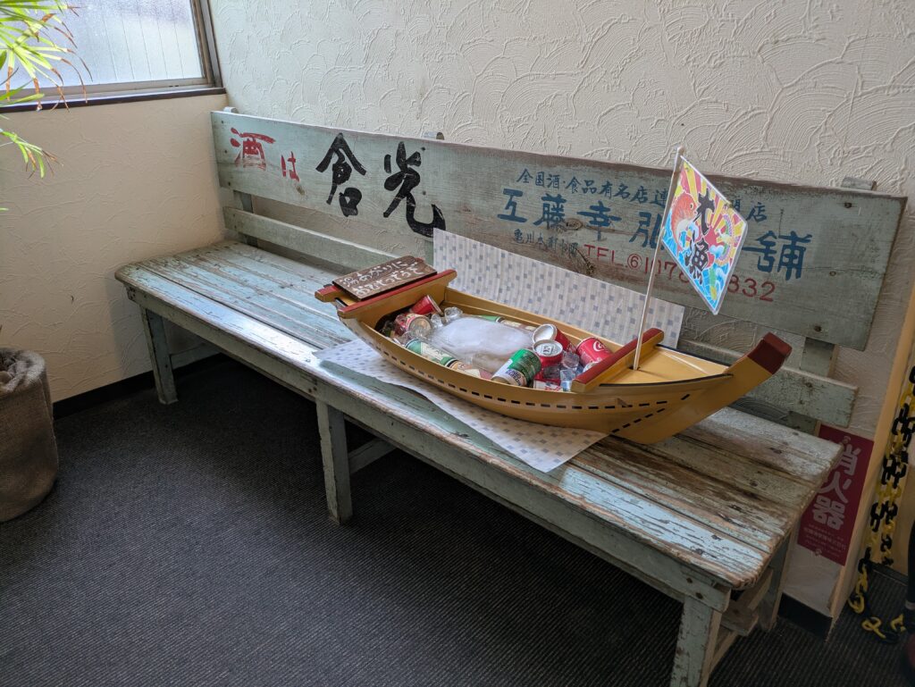 ほんのりささにごりのここちよい湯にすっかり茹だり、ほくほく顔で自室へ。そう廊下を歩いていると、見るからに年季の入った木のベンチに置かれた船盛が。よくよく見てみると、そこには氷で冷やされた湯上りの飲み物が。