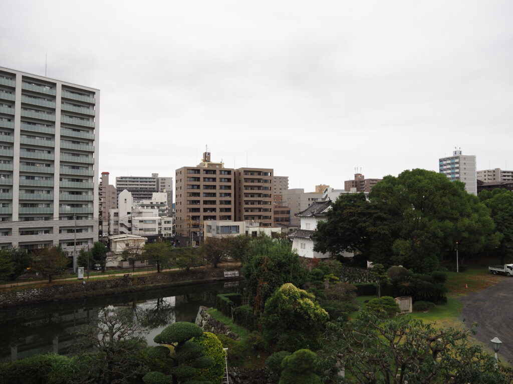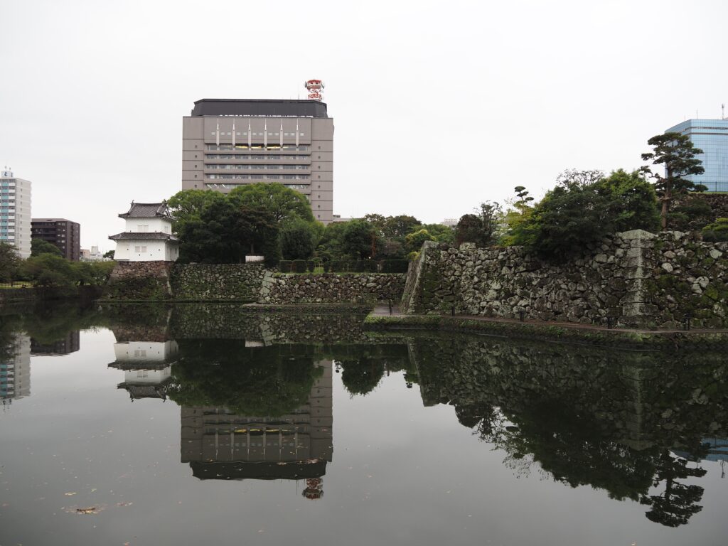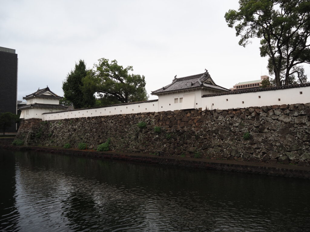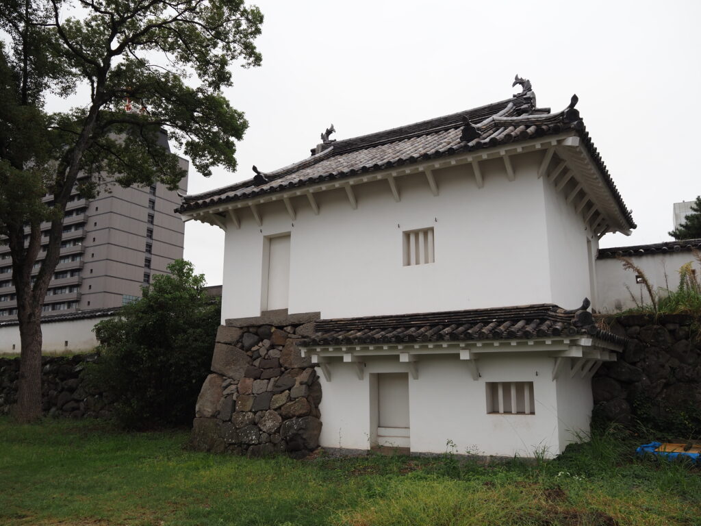 初めて訪れる県都大分。まずは、かつて府内城のあった大分城址公園へ。大きなビルの並ぶ大通りを進んでゆくと、お堀端に建つ端正な表情をした西之丸隅櫓が。