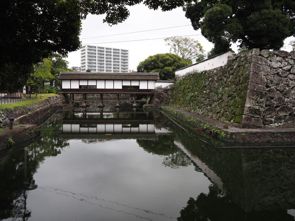 かつては月見や茶の湯、能などが営まれていたという山里丸を抜け帯曲輪を歩いてゆくと、お堀の対岸には府内城にもうひとつ残る江戸時代からの遺構である人質櫓が。