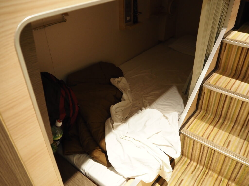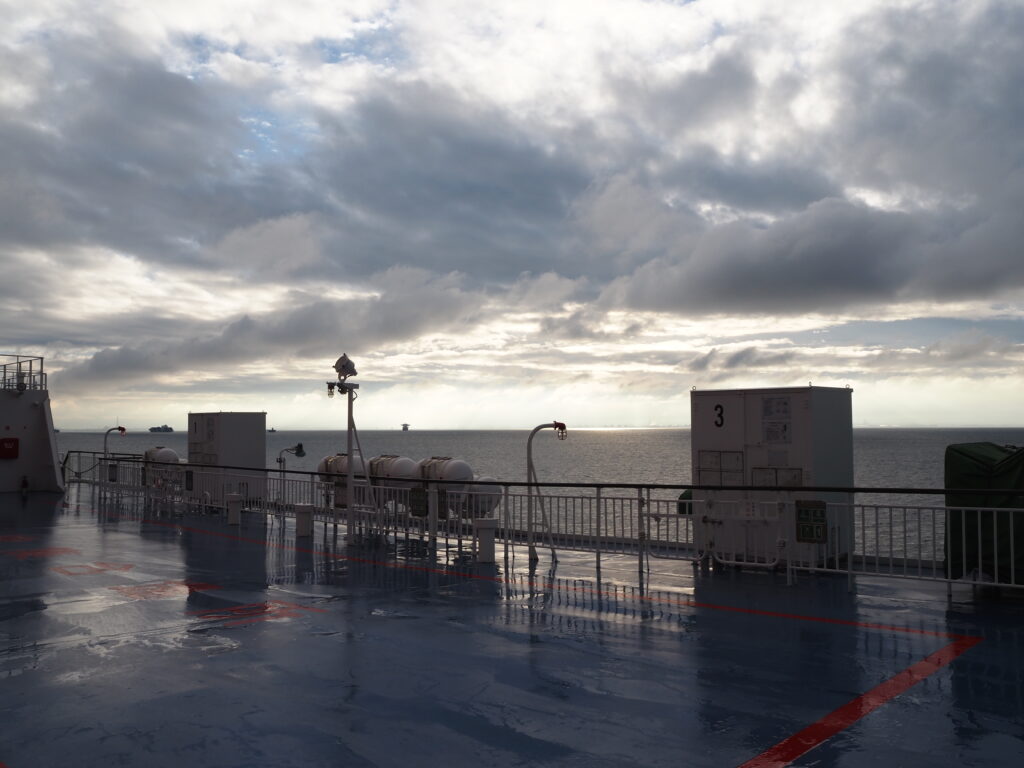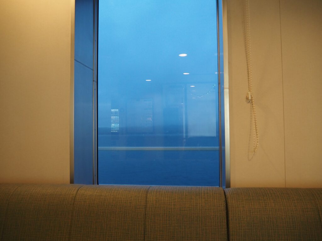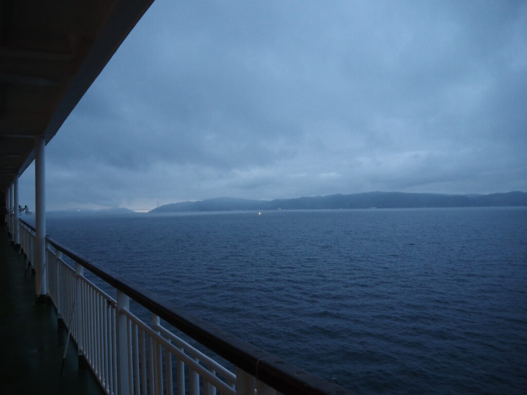 暗い寝台で、ふと目が覚める。いま何時なのか、自分がどこにいるのかもわからない。あまりの揺れのなさに一瞬そう寝ぼけつつもフェリーにいることを思い出し、トイレにでも行くかと一旦起きることに。