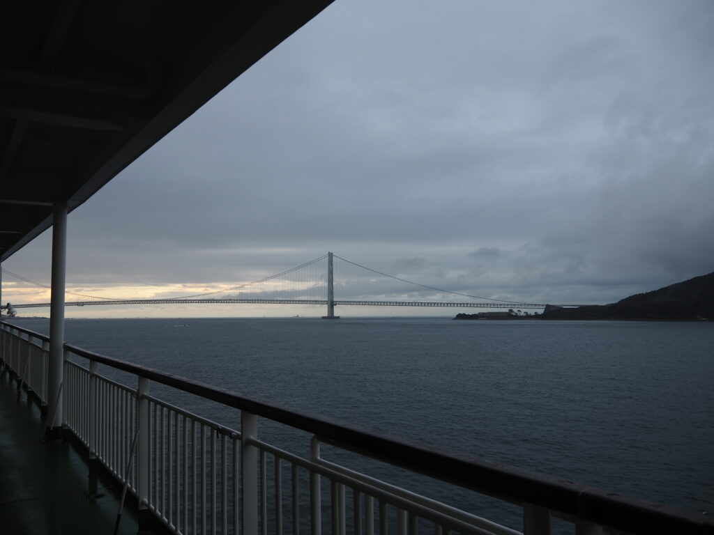この旅最後となる九州の味に満たされ、あさげも飲み干し朝ごはん終了。もう一度デッキの通路へと出てみれば、明石海峡大橋がもうあんな近くに見えている。淡路島一周を終え、岩屋港目指して一生懸命漕いだあの16年前の記憶が鮮明によみがえる。