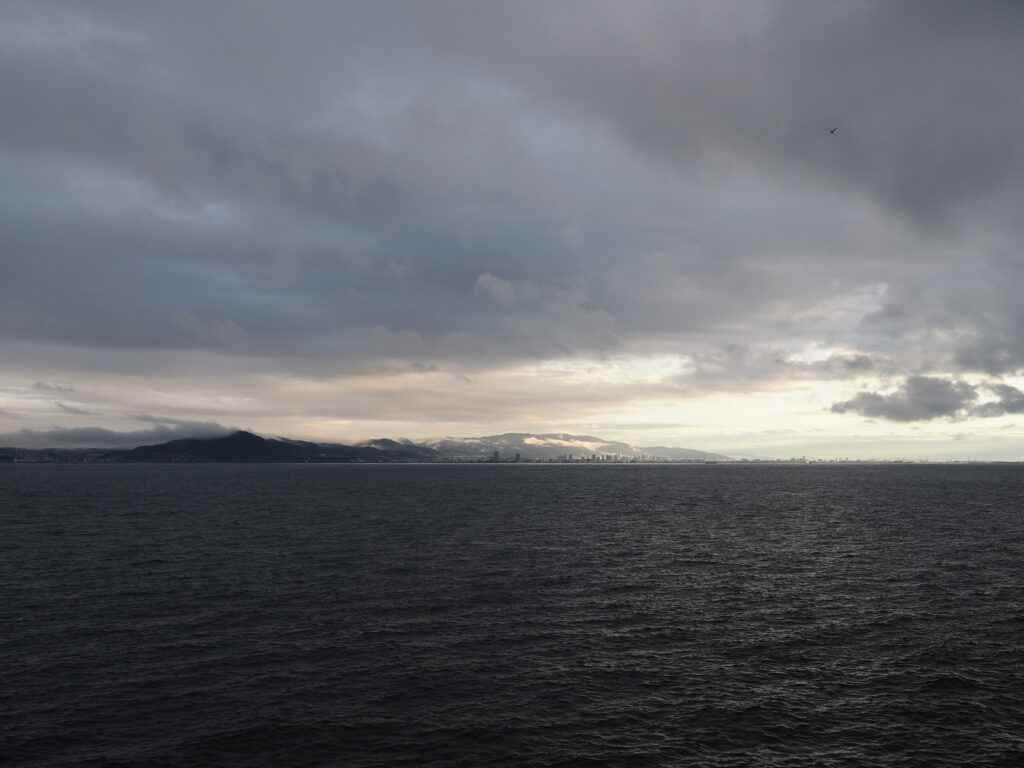あまりにも懐かしい記憶に胸を焦がしつつ、今度は左舷へ。朝日に照らされ薄い黄金に染まる雲、黒々と横たわる六甲山の麓に広がる神戸の街並み。この旅のメインともいえる船旅。その終焉の予感漂う情景に、胸がぎゅっと押しつぶされそうになる。