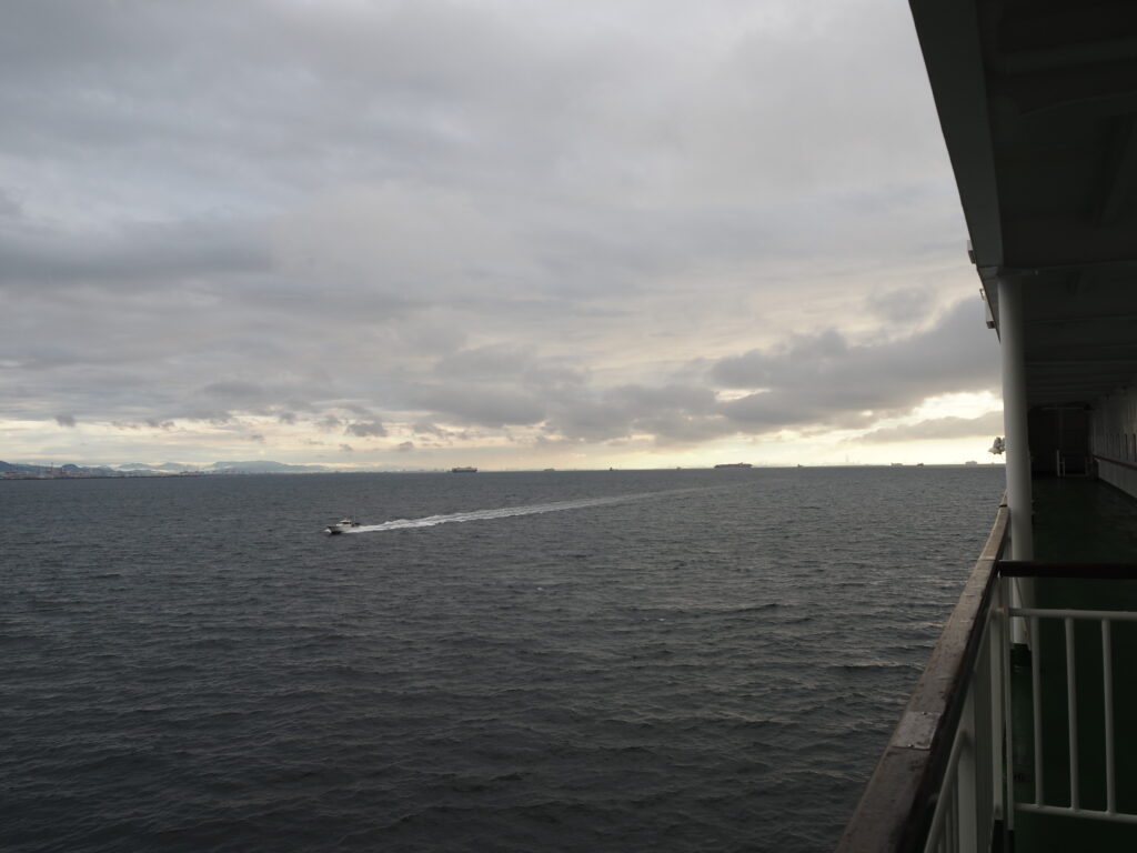 感傷にどっぷりと浸りつつ去りゆく航跡を見つめていると、船は北に向け大きく針路を変更。船ならではのゆったりとした遠心力に身をゆだねつつ、大阪や和歌山を目指す船たちに別れを告げます。