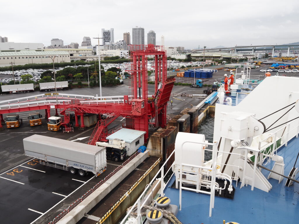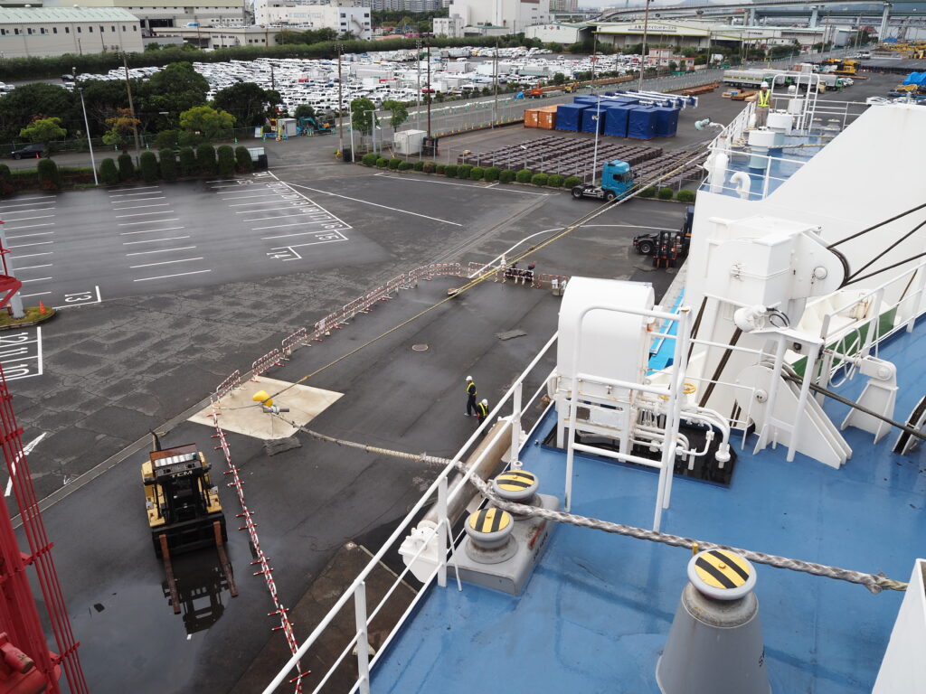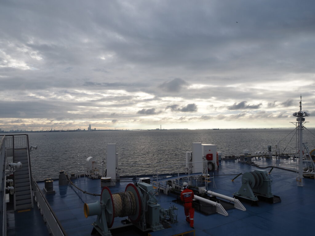 また新たに知った船旅の表情に思いを巡らせていると、続々と船尾に姿をあらわす甲板員。ドラムの試操作にロープの準備と、着岸に向け忙しさを増す作業。その様子を眺めていると、ついに六甲アイランドフェリーターミナルが。