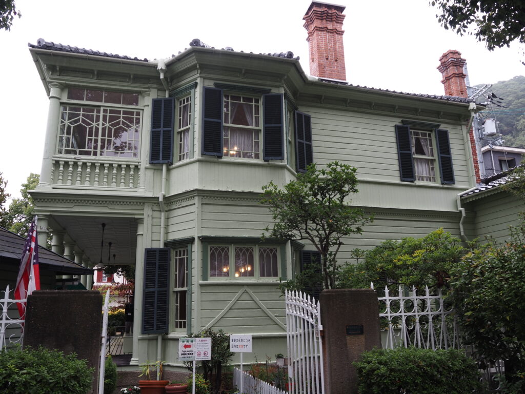 その斜め下には、その6年前にアメリカ総領事の屋敷として建てられたという萌黄の館。その名のとおりミントグリーンに彩られた下見板と、重厚なレンガ積みの煙突の対比が印象的。
