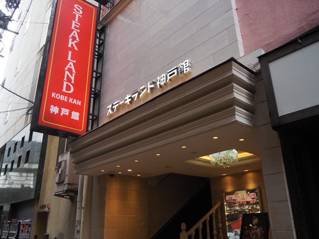 8時すぎに上陸し、駆け足になりつつもみっちり満喫してきた街歩き。時刻はもうお昼前、お目当てのお店は混みそうなので足早に駅方面へ。地図ではここら辺のはずだけど。そう思いつつ視線を上げれば、目指していた『ステーキランド神戸館』を発見。