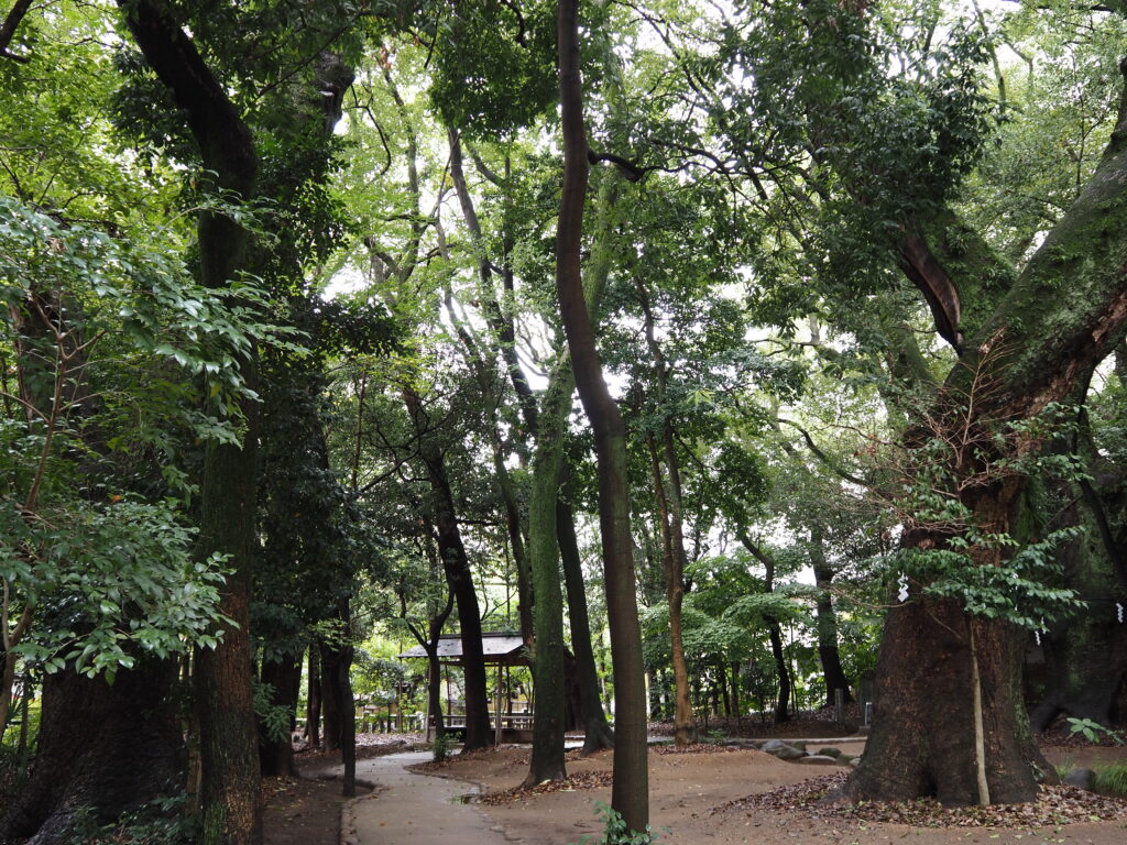 朱塗りの荘厳な社殿にお参りを終え奥へと歩いてゆくと、そこにはこんもりと木々の茂る森が。かつては広大な敷地を誇っていたという、生田神社の社叢。現在もその一部が遺され、生田の森として大切に守りつづけられています。