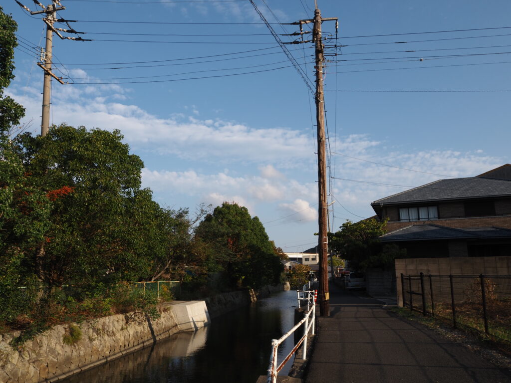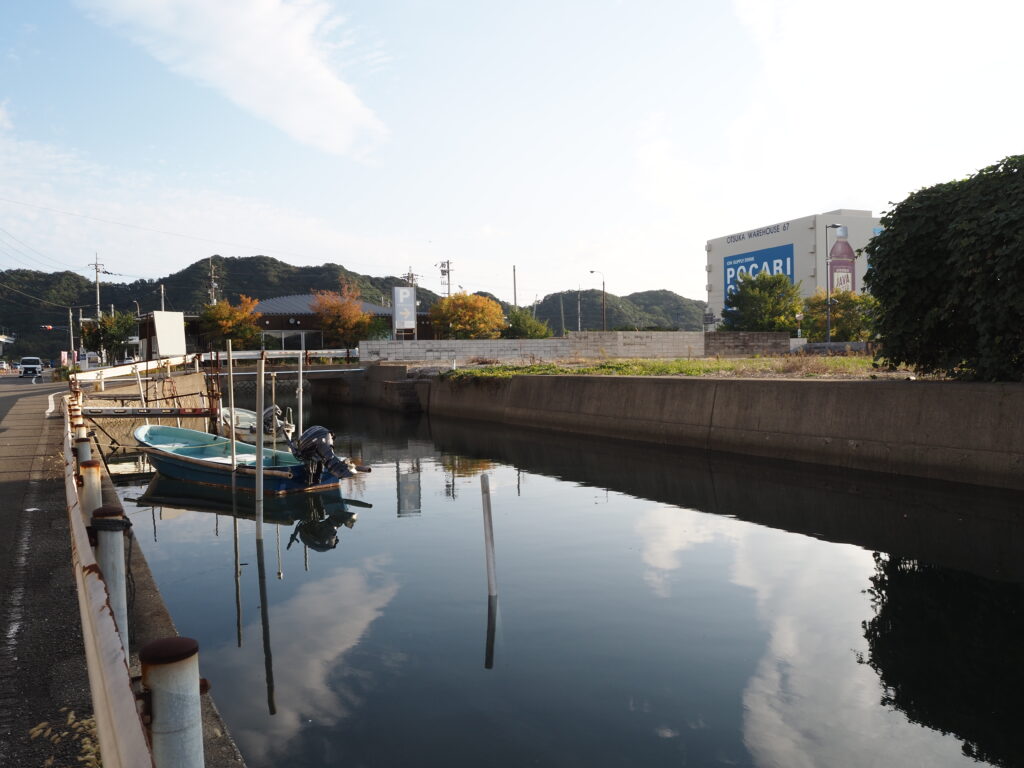 水路に沿って住宅街を歩いてゆくと、岸辺に係留された小さな舟が。地図を見ると撫養川や小鳴門海峡に通じているようで、ここから漁に出てゆくのだろう。