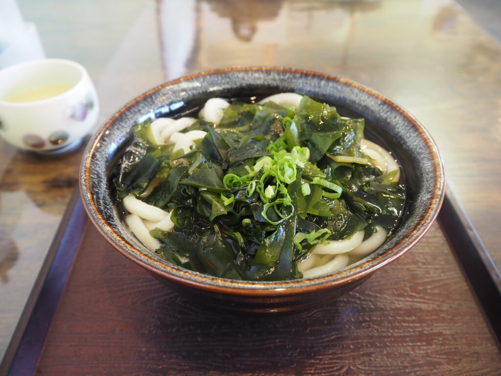 このお店は魚もおいしいらしく、刺身や焼魚、天ぷらにどんぶりと豊富なメニューの誘惑に負けそうになる。でもそこは初志貫徹、食べると決めていたわかめうどんを注文します。