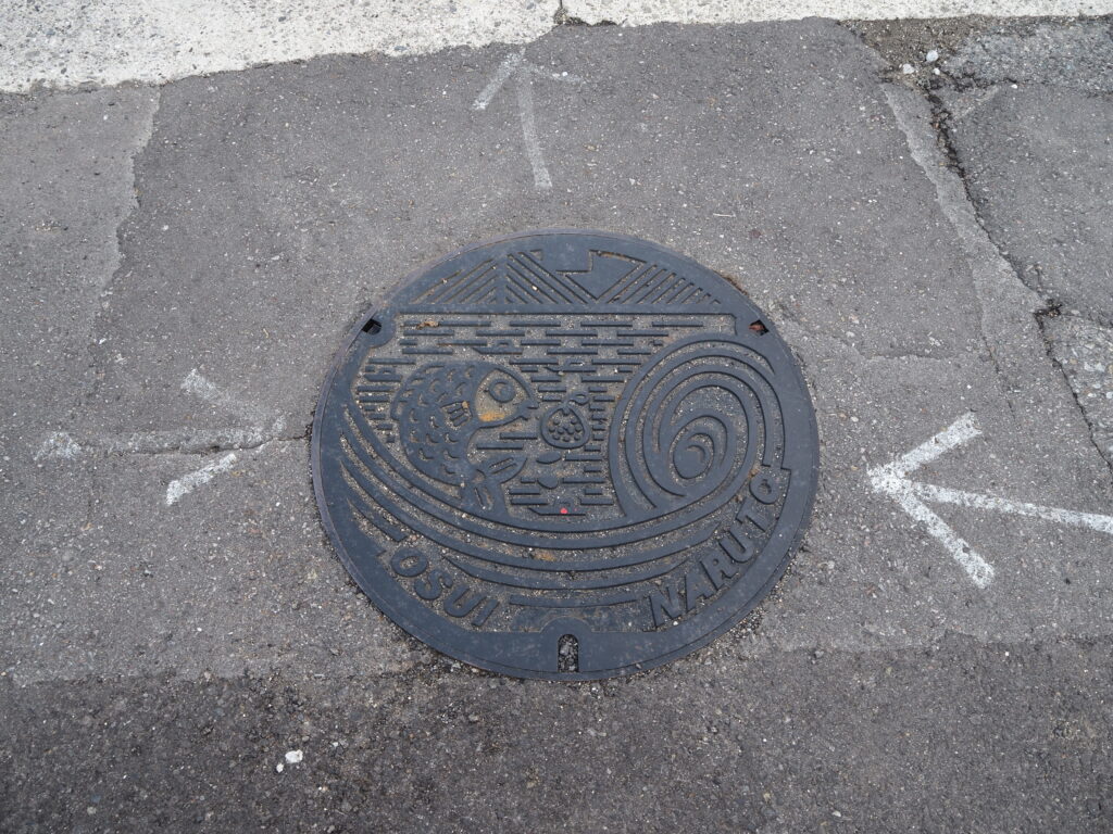 いやぁ、旨かった。だしもそうだが、わかめの主役感よ。激しい潮流の鳴門海峡に育まれたあの味は、ここに来たら必食だな。そんな余韻に包まれつつ、駅を目指して歩く道。足元には鯛や渦潮、海峡に梨と鳴門名物の描かれたかわいいマンホール。