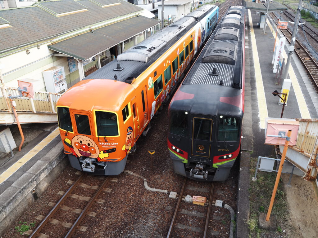 池谷から2700形の爆走に心酔すること46分、屋島に到着。跨線橋にのぼると、反対側には徳島行きのうずしお号が。そういえば、高徳線のアンパンマン列車ってデビューしたばかりだったはず。阪神電車に続き、僕運良すぎないか?