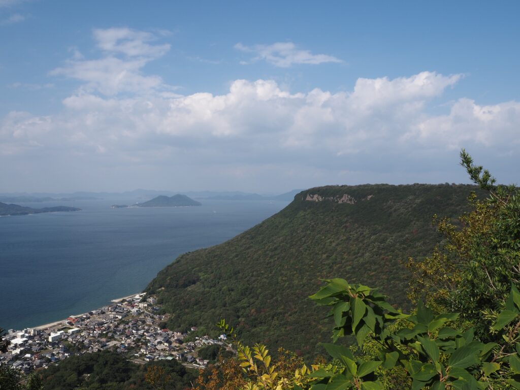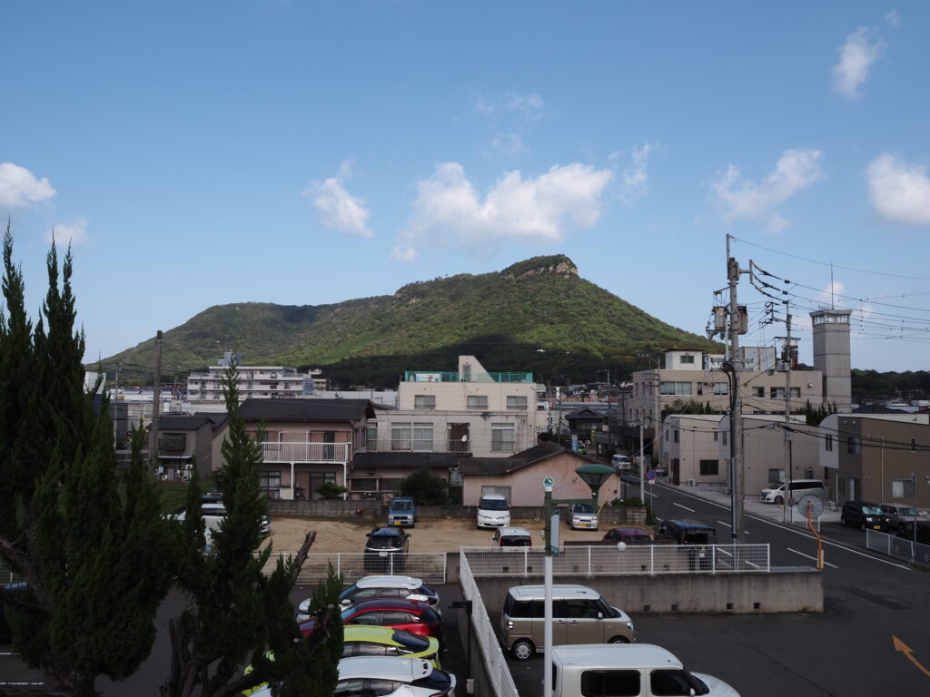 台地状の屋島の向かいには、ギザギザとした独特な山容をもつ五剣山が。5つの峰をもつことからその名が付いたそうで、山麓では国会議事堂にも使われたという庵治石が採石されています。