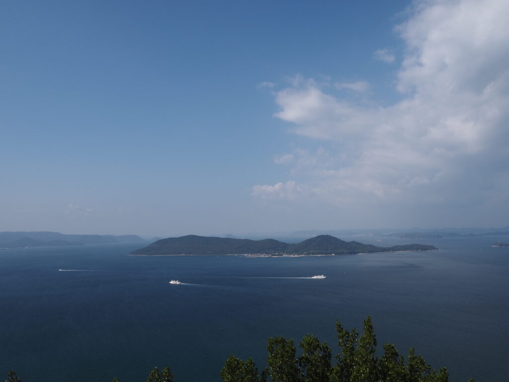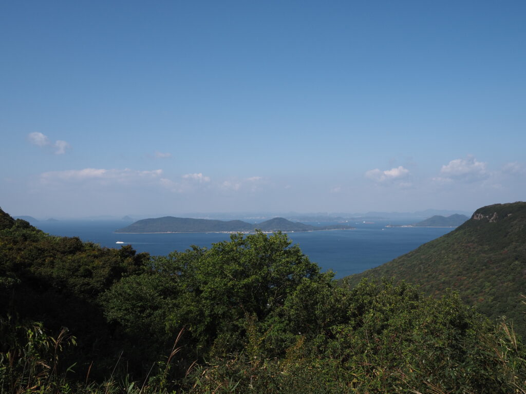 南嶺と北嶺を結ぶ尾根上をゆく遊歩道。左右には鬱蒼とした森が広がりますが、ときおり視界が開けこんな絶景が。瀬戸内に来るのは4度目になりますが、これほどまでに鮮烈な青さに染まる姿ははじめて。