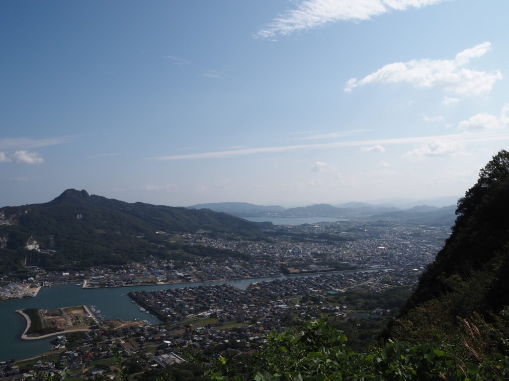 10月下旬初めての屋島獅子の霊巌からかわらけ投げの輪越しに高松の街を望む