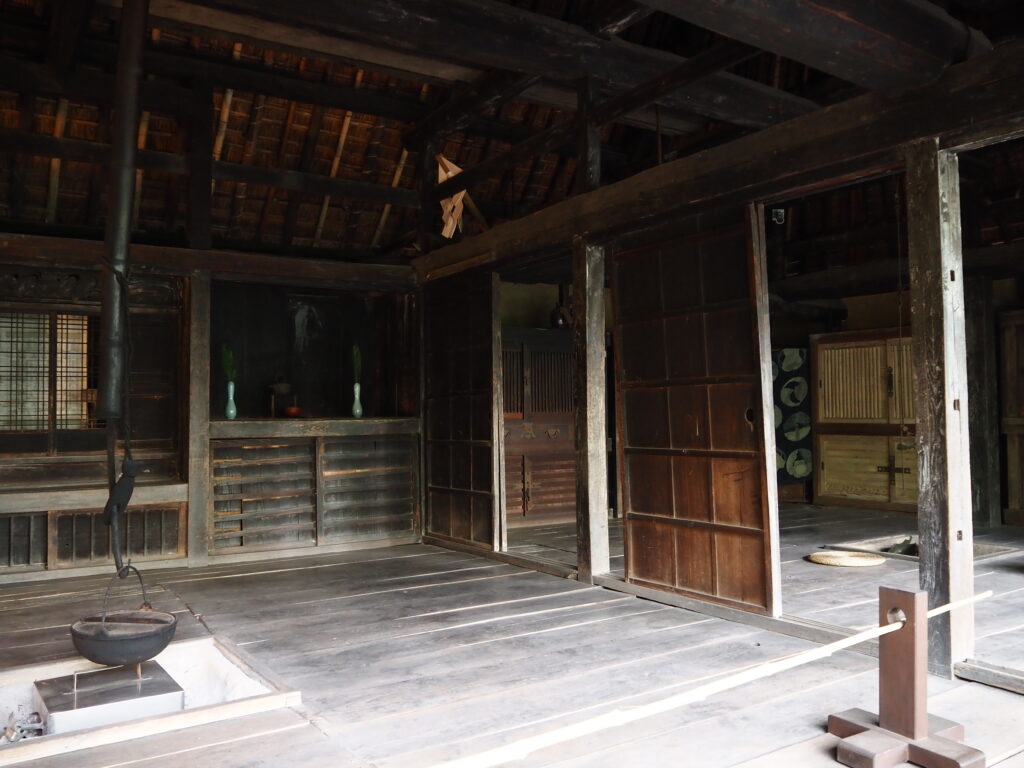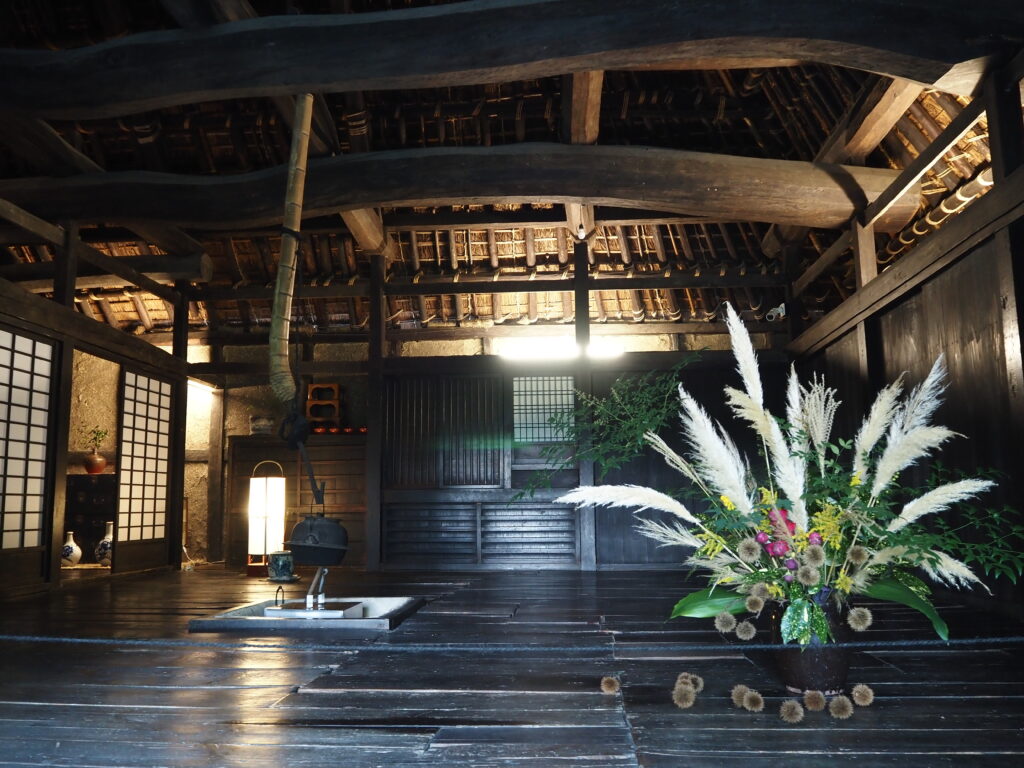 経てきた年月が色味として宿る室内を見てみれば、目を見張るほどの立派な梁。現代では手に入らないようなその太さも圧巻ですが、自然の曲がりを活かしつつこうして今なおしっかりと建ち続ける当時の大工仕事に圧倒されてしまう。