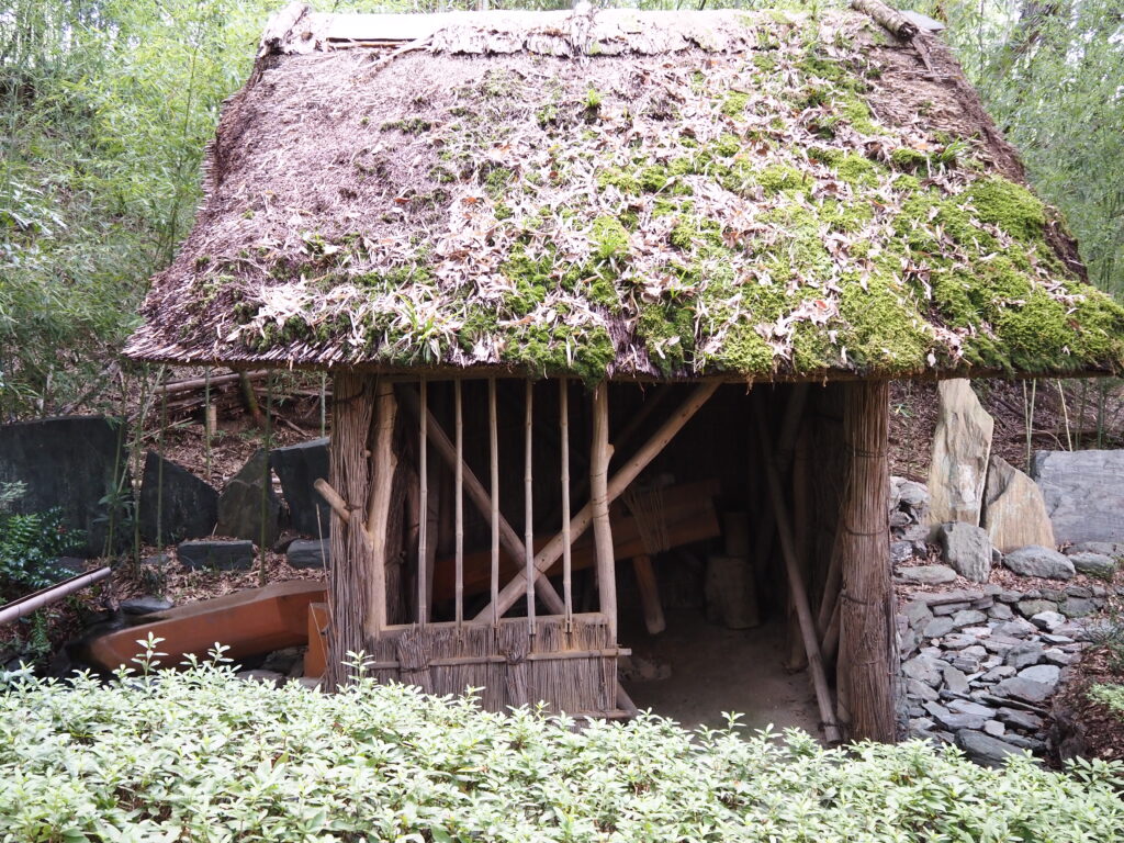 西日に染まる道にちょっとばかりの感傷を抱いていると、木々の下ぽつんと佇む茅葺が。大正末期から昭和初期にかけて建てられたというこの楮蒸し小屋は、高知は梼原町から移築されたもの。山間の寒い地域のため、外壁も断熱効果の高い茅が用いられています。