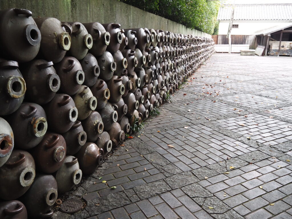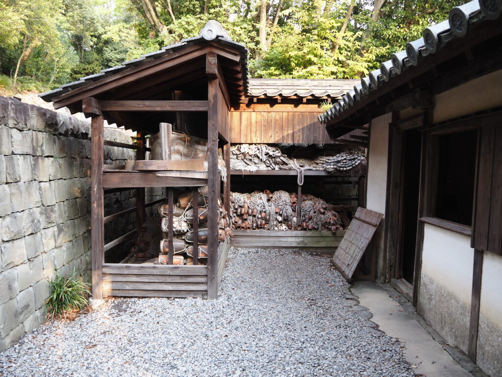 しょうゆの産地として名高い香川県。ここに移築されている醤油蔵は、小豆島とならび有名な引田にあったもの。その前には、かつて使われていたであろう醤油壺がずらりと並べられています。