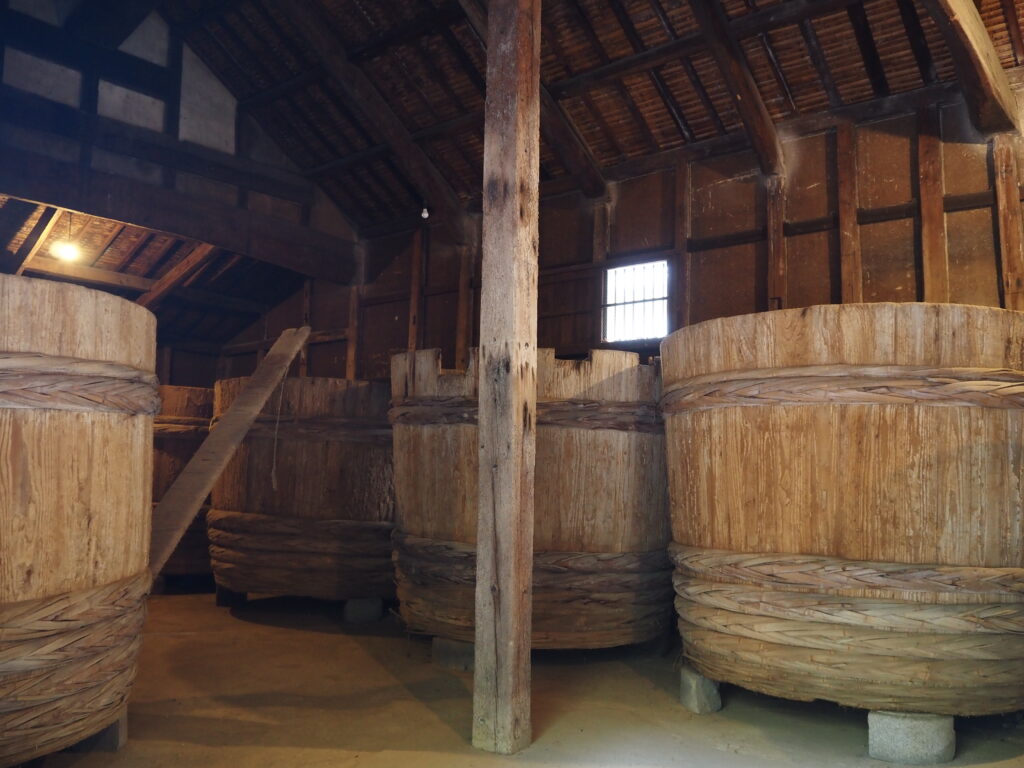 明治生まれの仕込蔵には、しょうゆ造りに使われた道具の展示が。酒と同じくしょうゆもかつては木桶で仕込んでおり、収蔵している木桶のなかには江戸時代に作られたものもあるそう。
