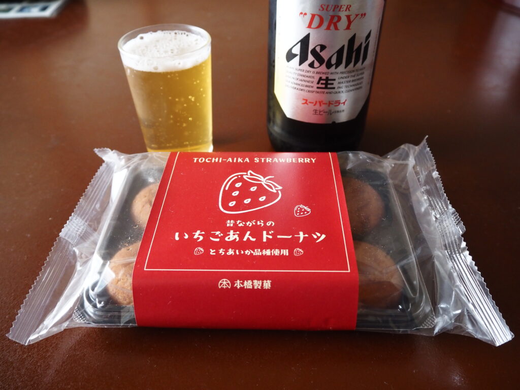 宇都宮の駅ビルのお土産屋さんでいろいろと目移りするなか、今回選んだのは本橋製菓の昔ながらのいちごあんドーナツ。栃木といえばのいちご、それもとちあいかの文字に魅かれて購入。