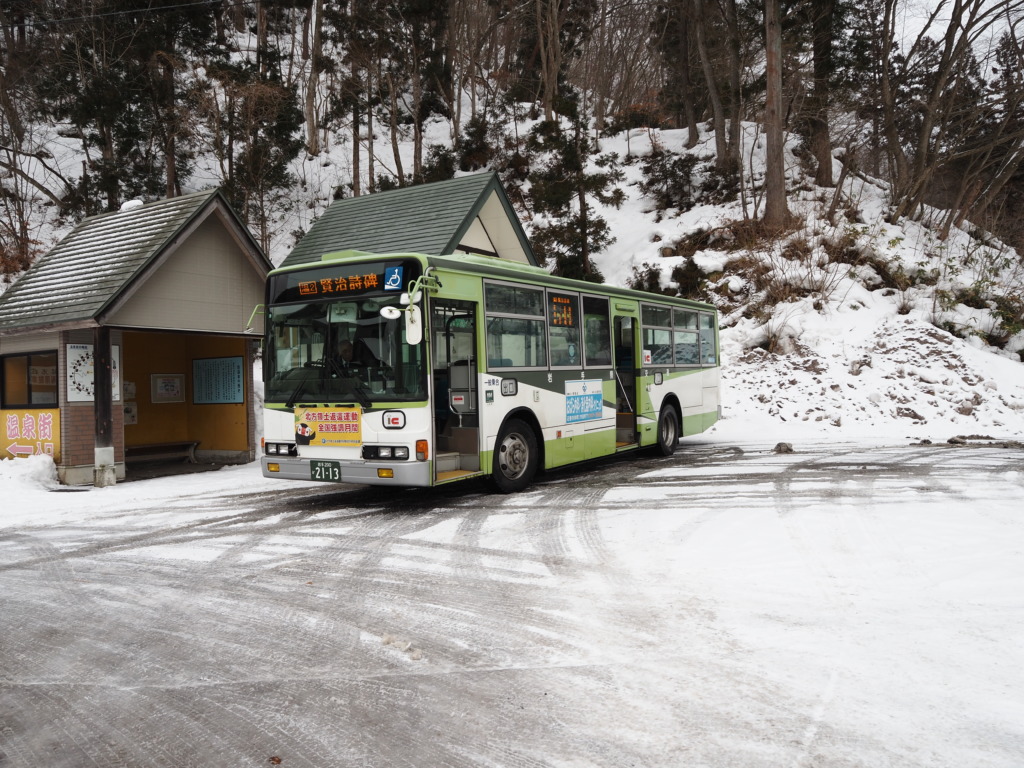 バスの時間に合わせ、名残惜しくもチェックアウト。松田屋旅館への再訪を固く誓い、台温泉バス停から『岩手県交通』の路線バスに乗り込みます。