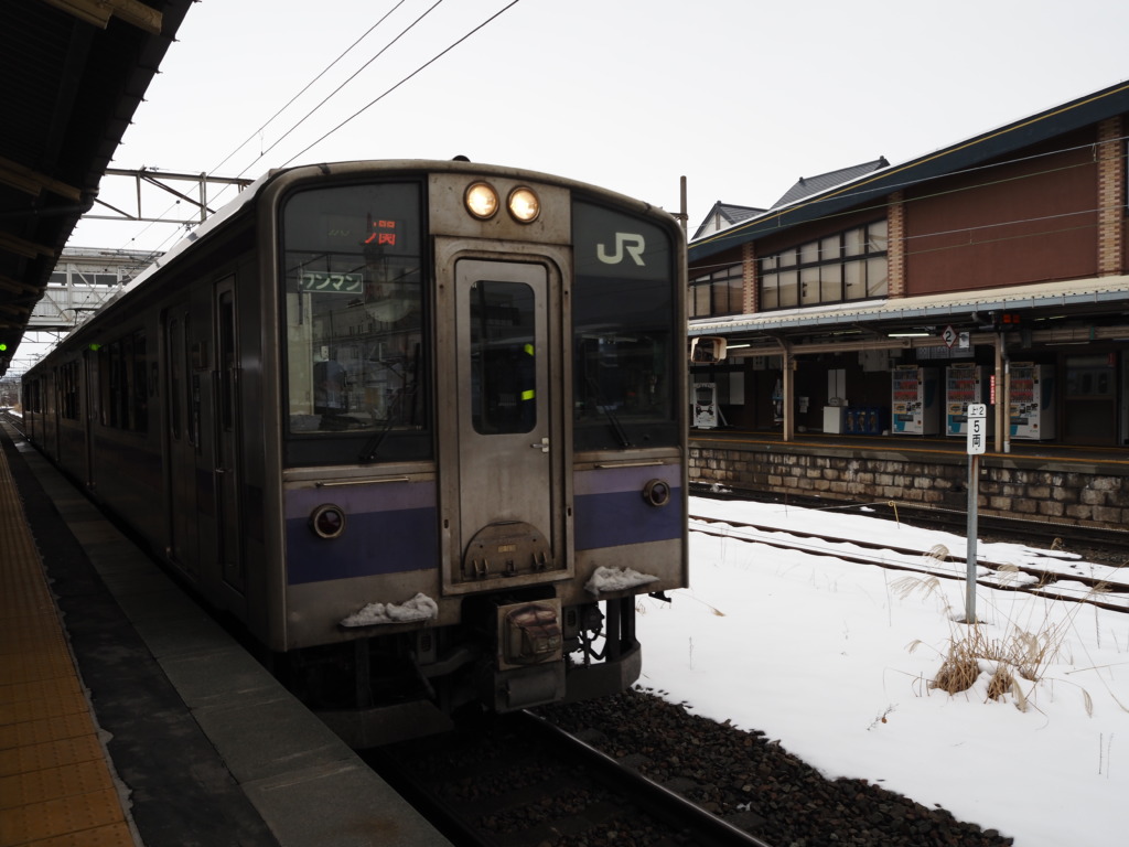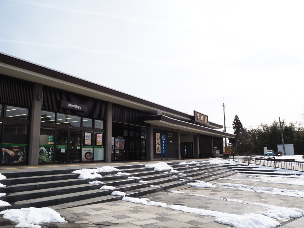 すっかり慣れ親しんだ701系に揺られ南下すること40分ちょっと、平泉に到着。ここに降り立つのは約5年半ぶり。それも冬に訪れるのは初めてのこと。おととい新幹線で通過したときはまったく雪がなかったのに、ほんのりとした白さに思わずうれしくなってしまう。