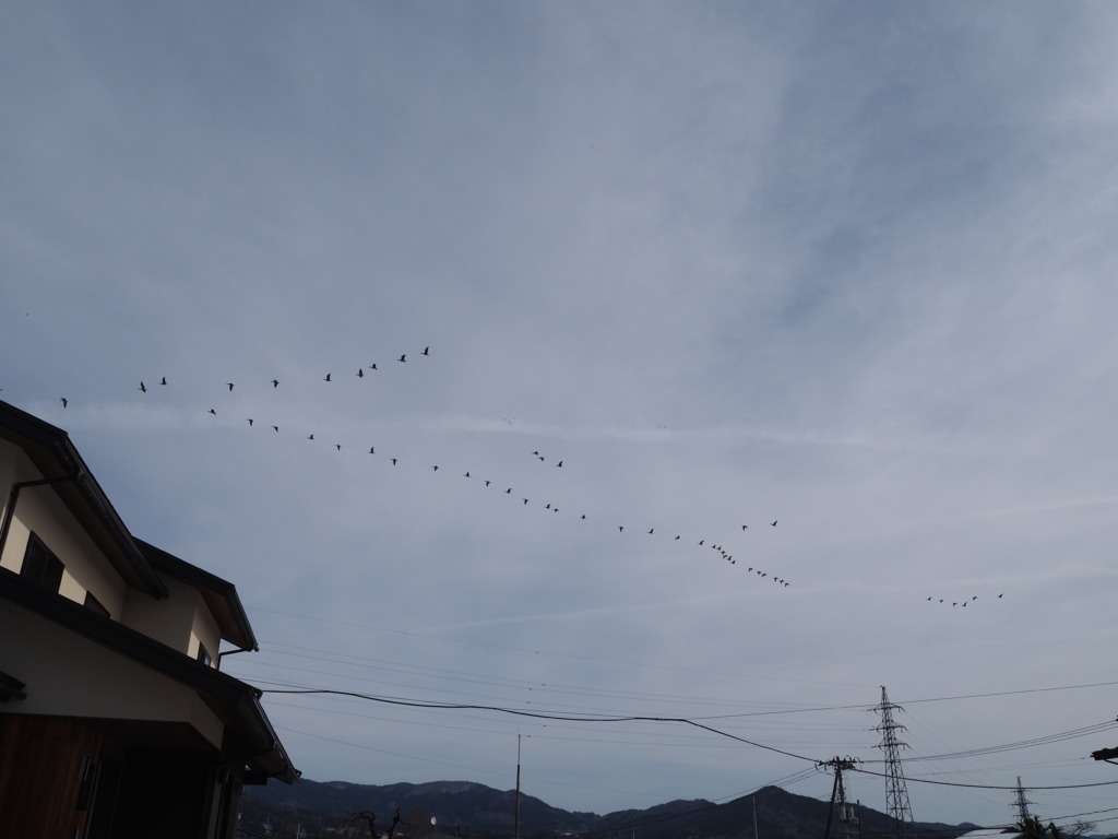 古くは中尊寺の参道として、その後宿場や幹線国道としての歴史を持つという中尊寺通り。両側に商店や民家の並ぶ渋い情緒を噛みしめつつ歩いてゆくと、頭上をかすめてゆく鳥の声。見上げれば、次から次へと来ては去りゆく雁の群れ。