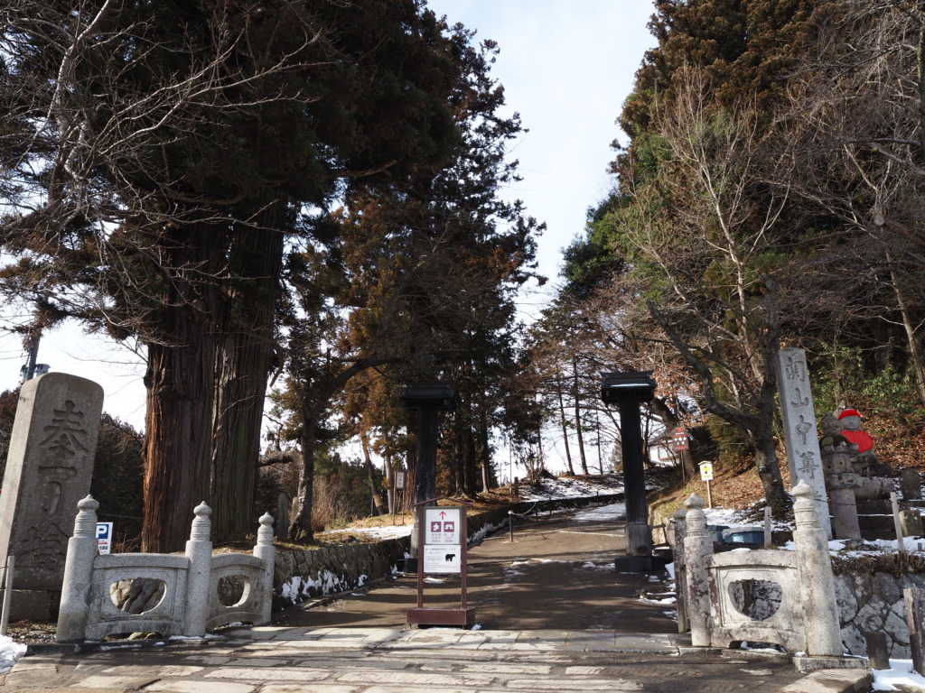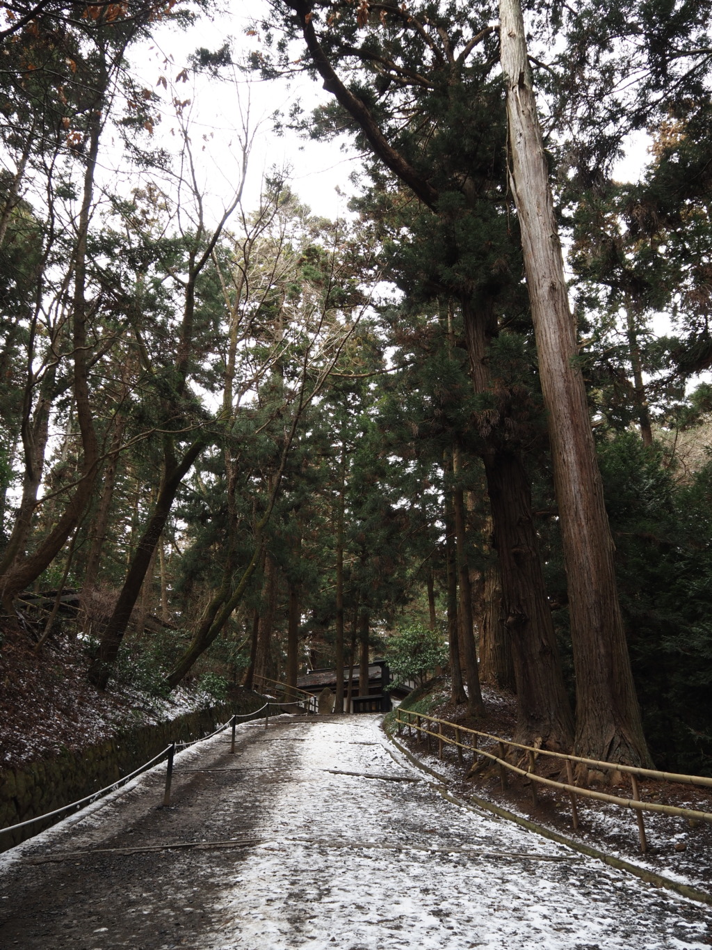 杉の老木に護られ、ひっそりとした空気に包まれる月見坂。うっすらと施された雪化粧が、その世界観をより一層荘厳なものにしてくれる。