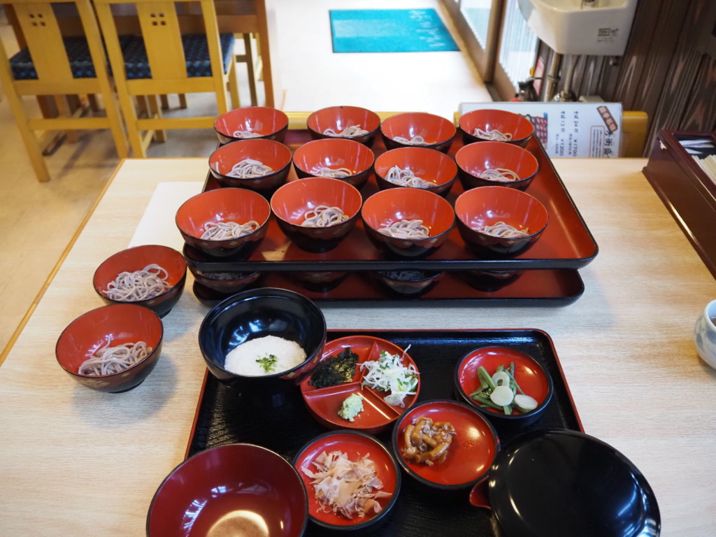 今回注文したのは、秀衡盛付わんこそば。岩手といえばの名物わんこそば。無限おかわりで有名な盛岡に対し、ここ平泉ではこうしてあらかじめお椀に盛り付けて一度に出すスタイル。12杯でざるそば1枚分、そしてこの24杯なら2枚分の量があるのだそう。