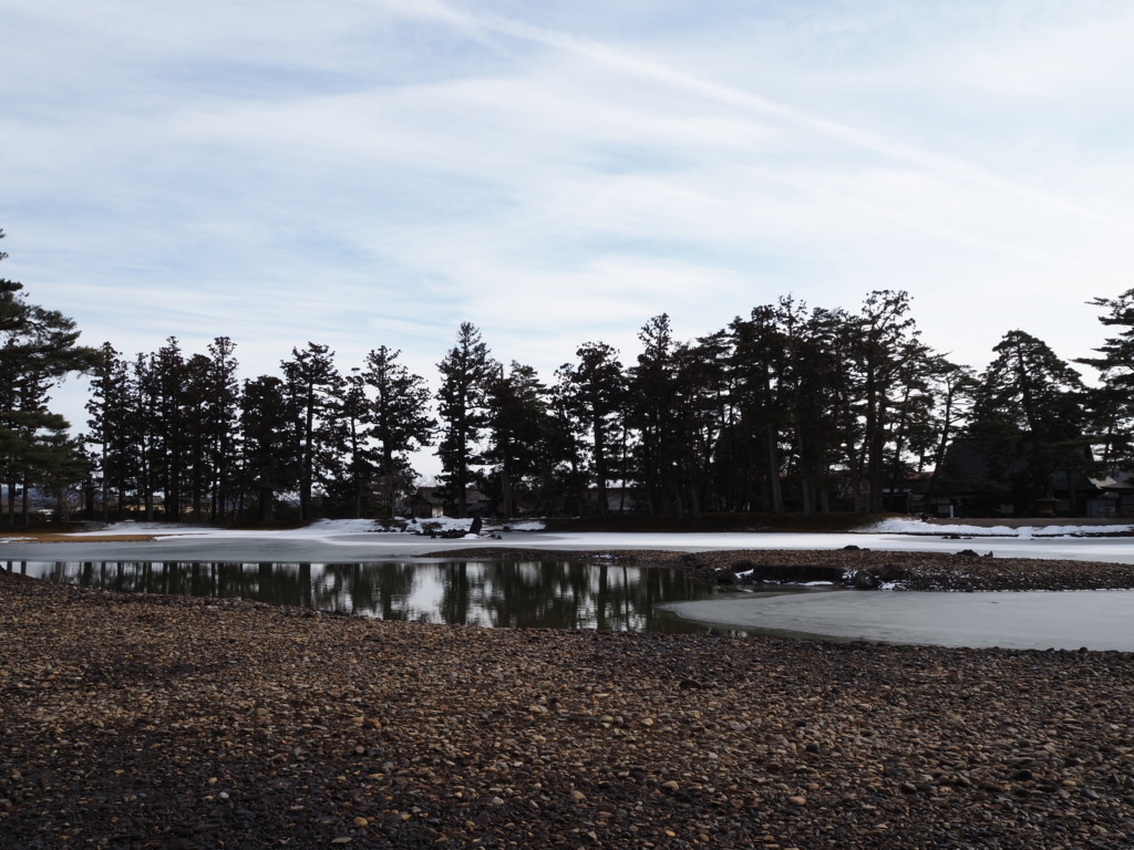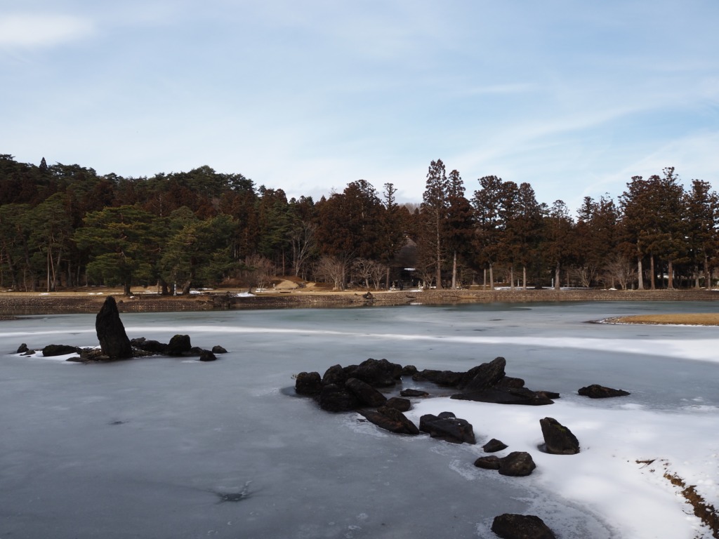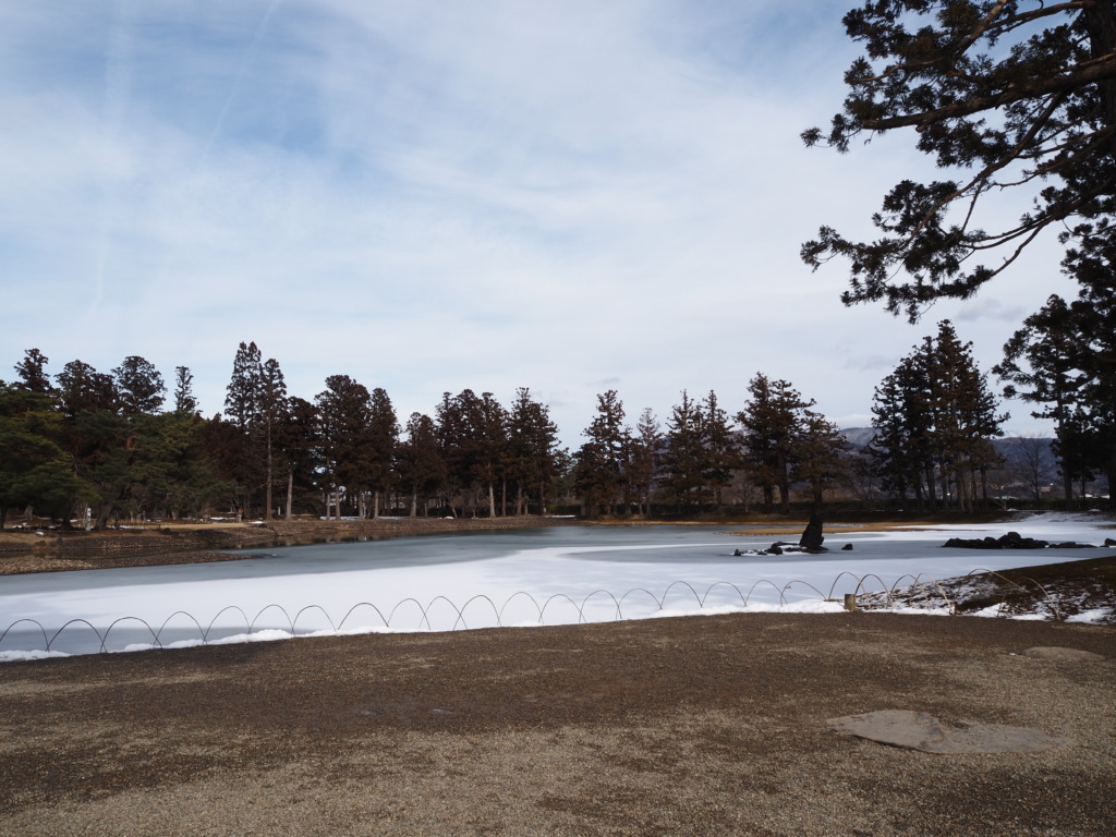 いつもは水辺と岩の質感の対比が印象的な築山も、池の凍る季節ではまったく異なる表情に。うっすらと雪の白さに覆われた大泉が池は、まさに静の世界。今日の庭園内には、池泉回遊式でありながら枯山水のようなぴんとした空気がはりつめている。