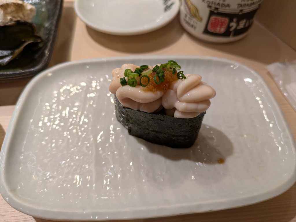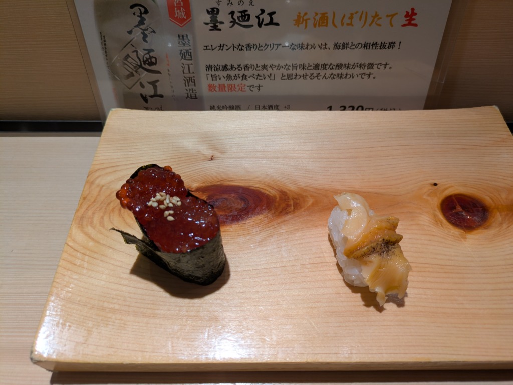 これまた大好物のすじこ、今度は軍艦で。塩で熟成されたすじこは、いくらとは一線を画すねっとり感。その塩分や旨味の凝縮感が酒を誘い、やっぱり僕はすじこ派だと謎の自負心が湧いてくる。